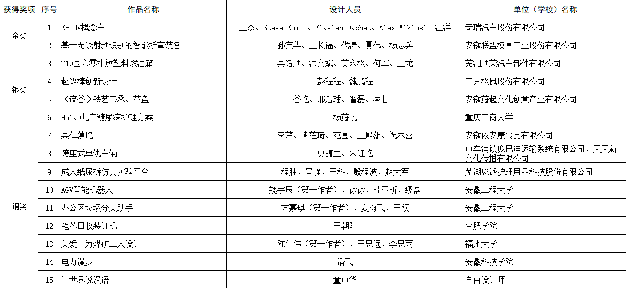 最終,來(lái)自奇瑞汽車(chē)的E-IUV概念車(chē)(概念設(shè)計(jì))與安徽聯(lián)盟模具工業(yè)有限公司的基于無(wú)線(xiàn)射頻識(shí)別的智能折彎裝備( 實(shí)物產(chǎn)品)榮獲本次大賽金獎(jiǎng),從設(shè)計(jì)理念、產(chǎn)品外形、先進(jìn)技術(shù)在產(chǎn)品中的應(yīng)用以及解決行業(yè)痛點(diǎn)等關(guān)鍵問(wèn)題上,以上作品在行業(yè)中均處于領(lǐng)先水平。同時(shí),來(lái)自順榮股份、三只松鼠、美的冰箱、中車(chē)龐巴迪(蕪湖)、安徽工程大學(xué)、安徽工業(yè)大學(xué)等企業(yè)、高校投稿作品也在本次大賽中取得了優(yōu)異的成績(jī)。